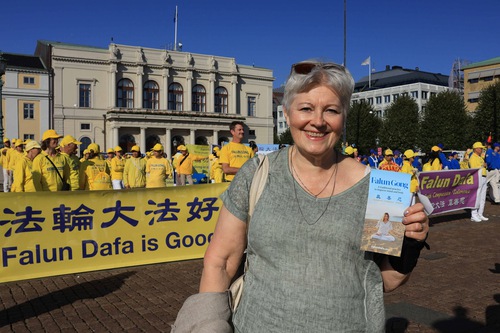 सेवानिवृत्त सचिव करिन सिदोली, फालुन दाफा का अभ्यास करने वाली एक मित्र द्वारा परेड के बारे में बताए जाने के बाद, परेड देखने आईं। वह गुस्ताफ एडोल्फ्स टॉर्ग को दाफा अभ्यासियों से भरा देखकर बहुत खुश हुईं। "यह अद्भुत है कि इतने सारे लोग यहाँ मौजूद हैं। यह अद्भुत है! मुझे लगता है कि और अधिक लोगों को फालुन दाफा और सत्य, करुणा और सहनशीलता के सिद्धांतों के बारे में जानने की आवश्यकता है।"