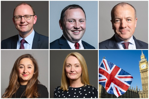 पहली पंक्ति (बाएं से दाएं): एंड्रयू कूपर सांसद, इयान मरे सांसद, माइक केन सांसद दूसरी पंक्ति (बाएं से दाएं): फ़ेरियल क्लार्क सांसद, जो प्लैट सांसद