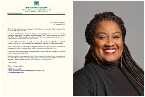 सांसद बेल रिबेरो-एडी ने अपने पत्र में कहा, "मैं फालुन गोंग अभ्यासियों सहित, विवेक के कैदियों के अंग निकालने के आरोपों से बेहद व्यथित हूँ। 2019 में सर जेफ्री नाइस केसी की अध्यक्षता में स्वतंत्र चीन न्यायाधिकरण के निष्कर्ष, जिसने बिना किसी संदेह के यह निष्कर्ष निकाला था कि इस तरह की कार्यवाहियां बड़े पैमाने पर हुई थीं, गंभीर चिंता का विषय बने हुए हैं।"
