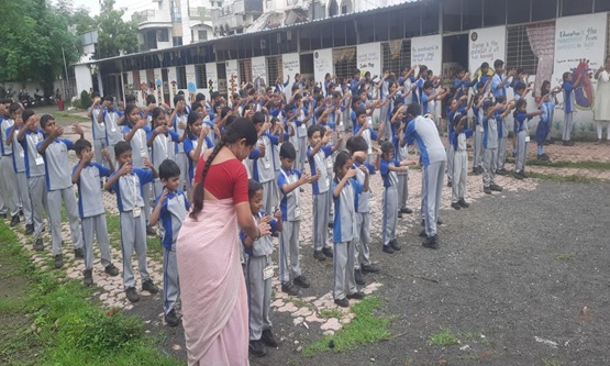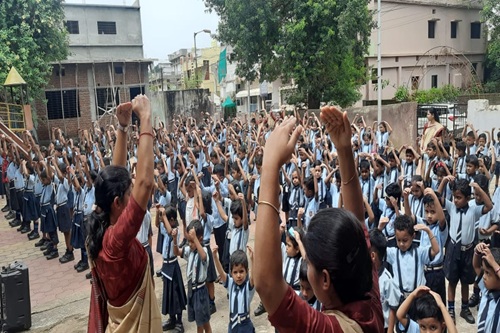गायत्री कॉन्वेंट के छात्र 5वां अभ्यास करते हुए।