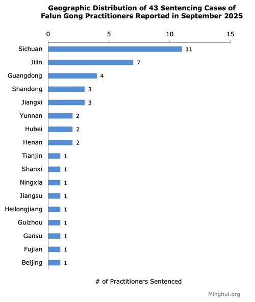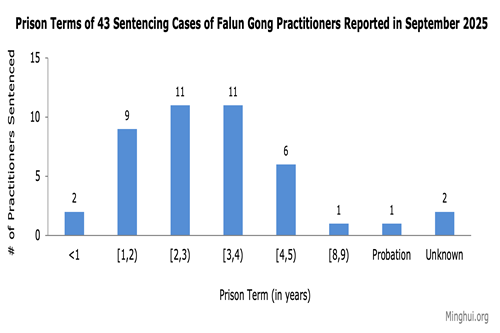 (Minghui.org) सितंबर 2025 में फालुन गोंग अभ्यासियों को उनके विश्वास के लिए जेल की सजा सुनाए जाने के कुल 43 मामले सामने आए।