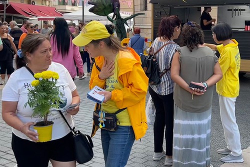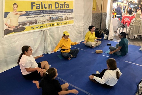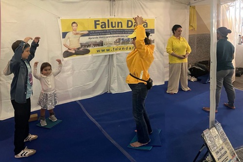 कई राहगीर रुककर अभ्यासियों को मधुर संगीत के साथ फालुन दाफा अभ्यास करते हुए देख रहे थे, और कुछ ने उन्हें आज़माने का फैसला किया। कई बच्चे बार-बार बूथ पर लौट रहे थे।