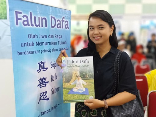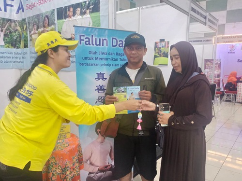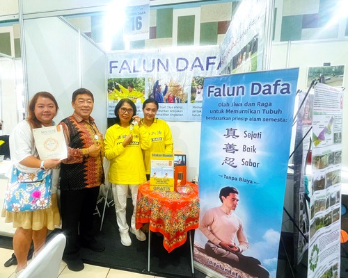 एक चीनी-इंडोनेशियाई दंपत्ति फालुन दाफा बूथ देखकर बहुत खुश हुए। उन्होंने बताया कि उन्होंने ऑस्ट्रेलिया की यात्रा के दौरान फालुन दाफा के बारे में सुना था, और उनकी पत्नी ने भी फालुन दाफा अभ्यासों को आज़माया था।
