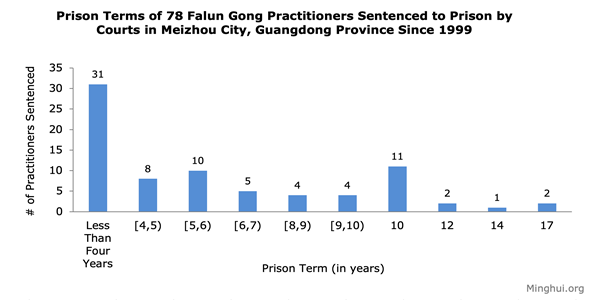 जेल की सजाएं (कुल 94 बार, क्योंकि 16 अभ्यासियों को दो बार सजा सुनाई गई) आठ स्थानीय अदालतों द्वारा सुनाई गईं: मेइक्सियन जिला न्यायालय, मेइजियांग जिला न्यायालय, जियाओलिंग काउंटी न्यायालय, वुहुआ काउंटी न्यायालय, ज़िंगनिंग सिटी न्यायालय, दाबू काउंटी न्यायालय, फेंगशुन काउंटी न्यायालय और मेइझोउ सिटी न्यायालय।
