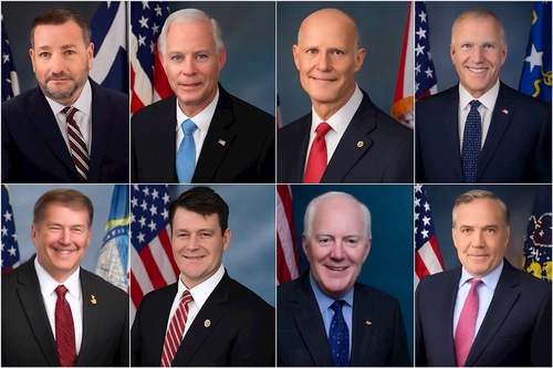 फालुन गोंग संरक्षण अधिनियम (एस.817) के सीनेटर प्रायोजक (बाएं से दाएं और ऊपर से नीचे): प्रायोजक टेक्सास रिपब्लिकन सीनेटर टेड क्रूज़, सह-प्रायोजक: सीनेटर रॉन जॉनसन (विस्कॉन्सिन), रिक स्कॉट (फ्लोरिडा), थॉम टिलिस (उत्तरी कैरोलिना), माइक राउंड्स (दक्षिण डकोटा), टॉड यंग (इंडियाना), जॉन कॉर्निन (टेक्सास), और डेविड मैककॉर्मिक (पेंसिल्वेनिया)।