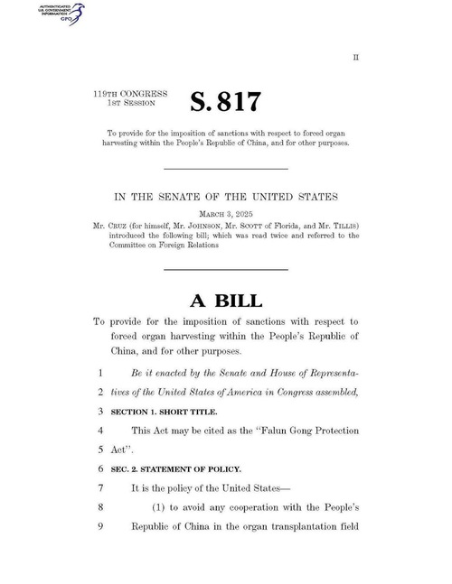 सीनेटर टेड क्रूज़ ने 3 मार्च, 2025 को फालुन गोंग संरक्षण अधिनियम (S.817) पेश किया। इस विधेयक में कहा गया है कि चीनी कम्युनिस्ट पार्टी (सीसीपी) अभी भी फालुन गोंग अभ्यासियों से जबरन अंग-हरण करवा रही है। इस विधेयक में जबरन अंग-हरण में शामिल लोगों पर कार्रवाई का प्रावधान है।