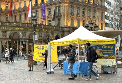 (Minghui.org) फालुन दाफा के अभ्यासियों ने 13 दिसंबर, 2025 को फ्रैंकफर्ट के केंद्र में एक सूचना दिवस का आयोजन किया। उन्होंने चीनी कम्युनिस्ट पार्टी (सीसीपी) द्वारा किए जा रहे उत्पीड़न और राज्य द्वारा स्वीकृत जबरन अंग प्रत्यारोपण के बारे में जानकारी देने वाले पर्चे वितरित किए। उन्होंने जनता को फालुन दाफा (फालुन गोंग) से भी परिचित कराया और इसके अभ्यासों का प्रदर्शन किया।