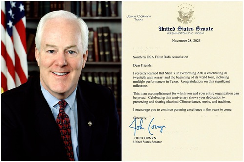 टेक्सास से अमेरिकी सीनेटर जॉन कॉर्निन ने लिखा, "मुझे हाल ही में पता चला कि शेन युन परफॉर्मिंग आर्ट्स अपनी बीसवीं वर्षगांठ मना रहा है और अपने विश्व दौरे की शुरुआत कर रहा है, जिसमें टेक्सास में कई प्रदर्शन शामिल हैं। इस महत्वपूर्ण उपलब्धि पर आपको हार्दिक बधाई।"