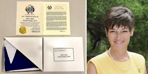 टेक्सास राज्य की सीनेटर डॉना कैम्पबेल (एमडी) ने वर्षगांठ के उपलक्ष्य में शेन युन को टेक्सास का ध्वज भेंट किया। (मिंगहुई डॉट ओआरजी)