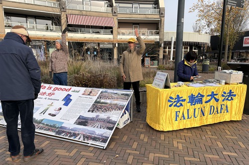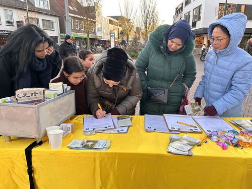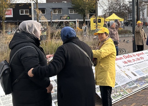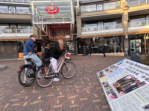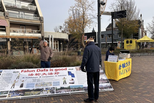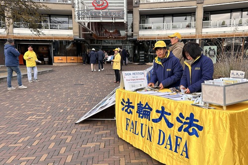 22 नवंबर को दोपहर के आसपास, अभ्यासियों ने हूगस्ट्राट पर प्रदर्शन बोर्ड लगाए। उन्होंने व्यायाम का प्रदर्शन किया, पर्चे बाँटे और चीन में चीनी कम्युनिस्ट पार्टी (सीसीपी) के 26 साल के उत्पीड़न के बारे में बात की। लोगों ने एक याचिका पर हस्ताक्षर किए जिसमें सीसीपी के उत्पीड़न और राज्य द्वारा अनुमोदित जबरन अंग-हरण के अत्याचार को रोकने की मांग की गई थी।