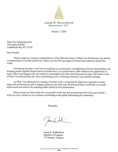 (Minghui.org) वर्जीनिया का प्रतिनिधित्व करने वाले अमेरिकी कांग्रेसी जेम्स वॉकिनशॉ ने शेन युन परफॉर्मिंग आर्ट्स समूह को उसकी स्थापना की 20वीं वर्षगांठ पर बधाई देने के लिए एक पत्र लिखा।
