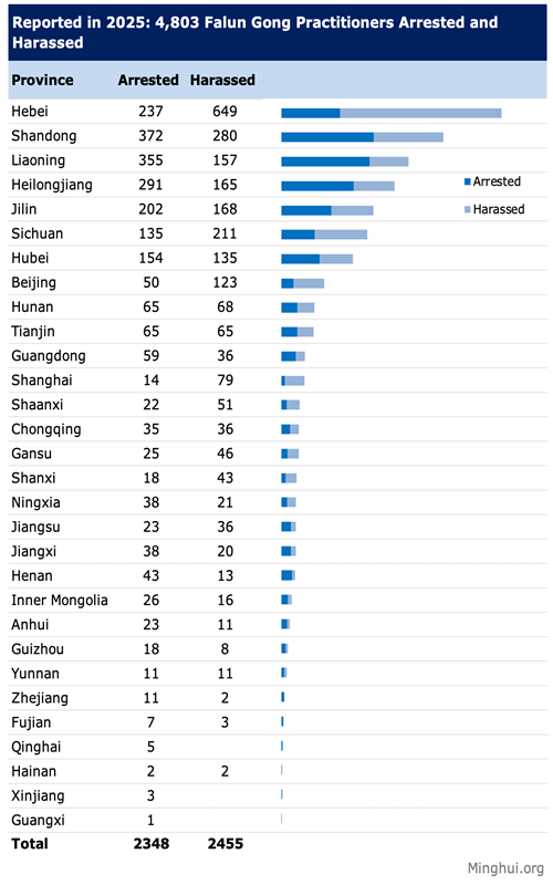 ऊपर दिए गए उदाहरण 2025 में दर्ज किए गए फालुन गोंग अभ्यासियों की गिरफ्तारी या उत्पीड़न के 4,803 मामलों में से मात्र तीन हैं। चीनी कम्युनिस्ट पार्टी (सीसीपी) की सख्त सूचना सेंसरशिप के कारण, जो अक्सर मिंगहुई संवाददाताओं को समय पर उत्पीड़न की जानकारी एकत्र करने और रिपोर्ट करने से रोकती है, रिपोर्ट की गई कुछ घटनाएं वास्तव में 2025 से पहले घटी थीं।