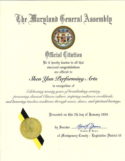 (Minghui.org) मैरीलैंड जनरल असेंबली के सीनेटर बेंजामिन क्रेमर ने 7 जनवरी, 2026 को शेन युन परफॉर्मिंग आर्ट्स को बधाई देने के लिए एक आधिकारिक प्रशस्ति पत्र जारी किया।
