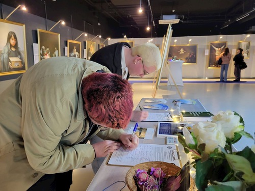 आगंतुकों ने बीजिंग से फालुन गोंग के उत्पीड़न को समाप्त करने की मांग करते हुए याचिका पर हस्ताक्षर किए।