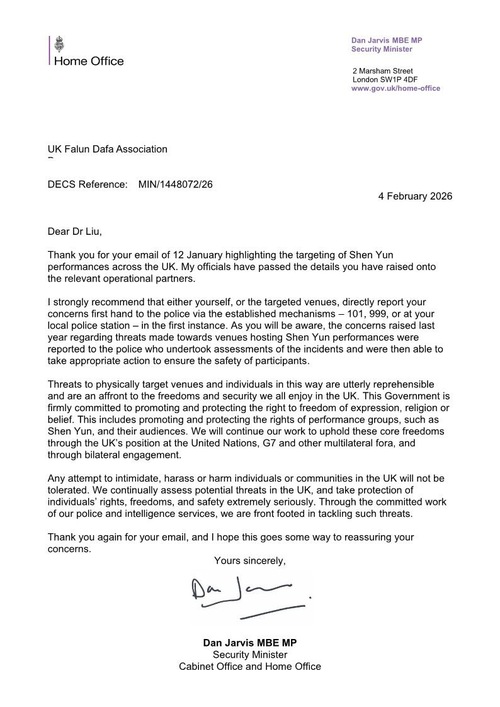 (Minghui.org) 4 फरवरी, 2026 को यूके फालुन दाफा एसोसिएशन को लिखे एक पत्र में, यूके के सुरक्षा मंत्री डैन जार्विस ने लिखा: "इस तरह से स्थानों और व्यक्तियों को शारीरिक रूप से निशाना बनाने की धमकियां पूरी तरह से निंदनीय हैं और यूके में हम सभी को प्राप्त स्वतंत्रता और सुरक्षा का अपमान हैं।"