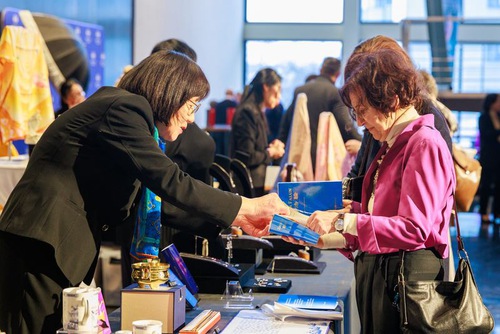 22 जनवरी, 2026 को वियना सिटी हॉल में शेन युन को देखने वाले लोग फालुन दाफा की किताबें देख रहे हैं। (द इपोक टाइम्स)