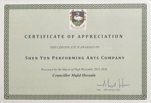 (Minghui.org) शेन युन परफॉर्मिंग आर्ट्स ग्लोबल कंपनी ने 21 फरवरी, 2026 को ब्रिटेन के हाई वायकोम्ब में वायकोम्ब स्वान थिएटर में खचाखच भरे हॉल में प्रस्तुति दी। मेयर माजिद हुसैन ने कंपनी को उसके उत्कृष्ट प्रदर्शन और स्थानीय समुदाय में सांस्कृतिक योगदान के लिए प्रशंसा पत्र प्रदान किया।