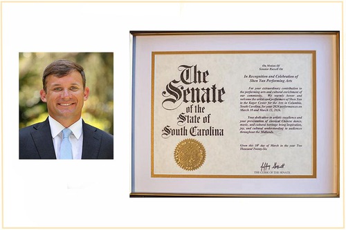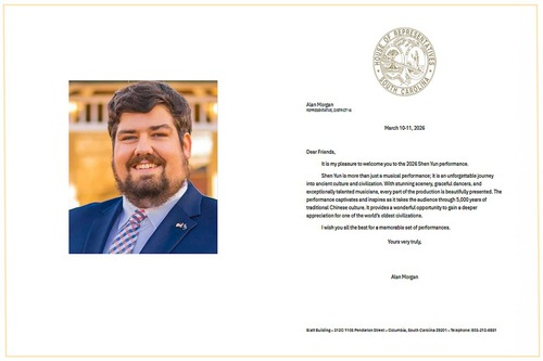 दक्षिण कैरोलिना के सीनेटर रसेल ओट ने शेन युन का दक्षिण कैरोलिना में हार्दिक स्वागत किया और एक घोषणा जारी करते हुए कहा, "हमारे समुदाय की कला और सांस्कृतिक समृद्धि में आपके असाधारण योगदान के लिए शेन युन परफॉर्मिंग आर्ट्स को सम्मानित और प्रोत्साहित करते हुए, हम दक्षिण कैरोलिना के कोलंबिया स्थित कोगर सेंटर फॉर द आर्ट्स में 10 और 11 मार्च, 2026 को शेन युन के कलाकारों और प्रस्तुतिकर्ताओं का हार्दिक स्वागत करते हैं।"