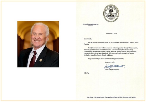 अपने बधाई पत्र में, गवर्नर मैकमास्टर ने लिखा, "मुझे आपको दक्षिण कैरोलिना के कोलंबिया में 2026 शेन युन प्रदर्शन में स्वागत करते हुए खुशी हो रही है।"