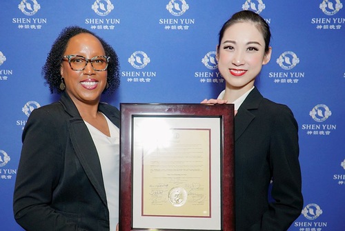 10 मार्च, 2026 की शाम को, कोलंबिया नगर परिषद की चीफ ऑफ स्टाफ चानिक बेल्टन (बाएं) ने शेन युन परफॉर्मिंग आर्ट्स को प्रशंसा पत्र प्रदान किया। (एनटीडी टेलीविजन)