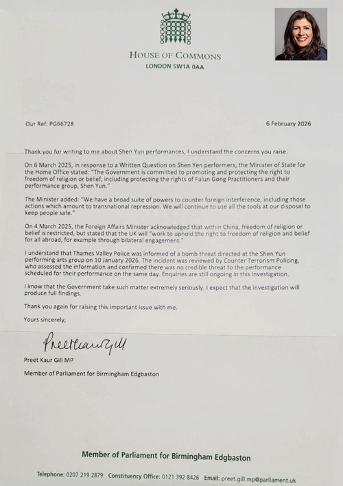 बर्मिंघम एडगबास्टन की सांसद प्रीत कौर गिल ने लिखा, "6 मार्च 2025 को, शेन युन कलाकारों पर एक लिखित प्रश्न के जवाब में, गृह मंत्रालय के राज्य मंत्री ने कहा: 'सरकार धर्म या आस्था की स्वतंत्रता के अधिकार को बढ़ावा देने और उसकी रक्षा करने के लिए प्रतिबद्ध है, जिसमें फालुन गोंग अभ्यासियों और उनके प्रदर्शन समूह, शेन युन के अधिकारों की रक्षा करना शामिल है।'
