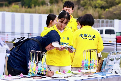 मिज़ुनो जी, जिन्होंने एक दिन पहले अभ्यासियों से मुलाकात की थी, अगली सुबह चाय और नाश्ते के वाउचर लेकर आईं और उन्हें अपने चाय स्टॉल पर आमंत्रित किया। फ़ालुन दाफा और चीन में हो रहे कठोर उत्पीड़न के बारे में जानने के बाद, उन्होंने चीनी कम्युनिस्ट पार्टी (सीसीपी) द्वारा किए जा रहे जबरन अंग-निकालने को समाप्त करने की अपील वाली याचिका पर हस्ताक्षर किए।