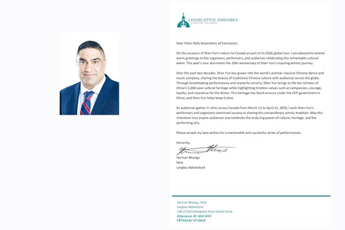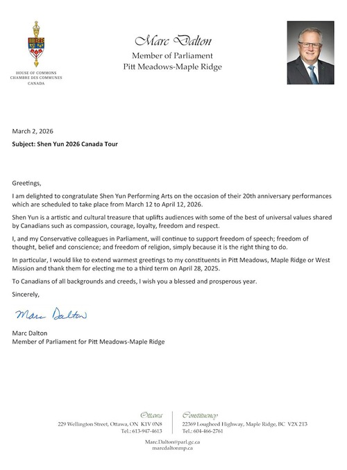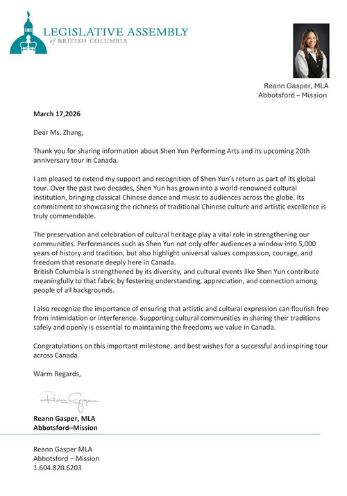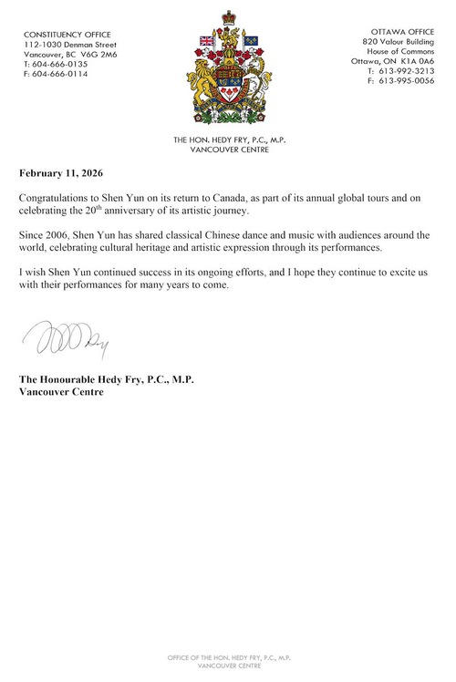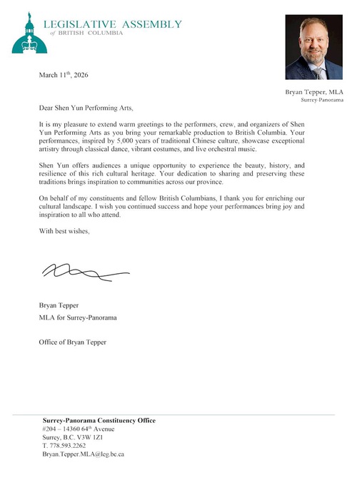 (Minghui.org) शेन यून नॉर्थ अमेरिका कंपनी 8 से 12 अप्रैल, 2026 तक वैंकूवर के क्वीन एलिजाबेथ थिएटर में छह शो पेश कर रही है। ब्रिटिश कोलंबिया में संघीय, प्रांतीय और शहर सरकारों के निर्वाचित अधिकारियों ने शेन यून का कनाडा में स्वागत करने और कंपनी को उसकी 20 वीं वर्षगांठ पर बधाई देने के लिए पत्र या घोषणाएं जारी की हैं।