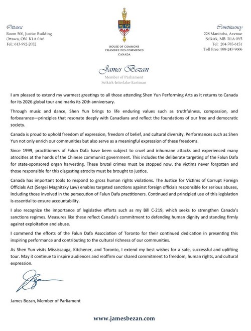 मैनिटोबा के सांसद जेम्स बेज़ान ने लिखा, "मुझे शेन यून परफॉर्मिंग आर्ट्स में भाग लेने वाले सभी लोगों को हार्दिक बधाई देते हुए खुशी हो रही है क्योंकि यह अपने 2026 के वैश्विक दौरे के लिए कनाडा लौट रहा है और अपनी 20 वीं वर्षगांठ को चिह्नित करता है।