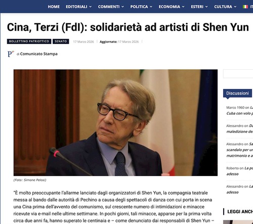 सीनेटर टेरज़ी ने एक महीने पहले रोम में शेन युन देखा था। उन्होंने कलाकारों, प्रतिभागियों और शो को सफल बनाने के लिए कड़ी मेहनत करने वाले अन्य लोगों को धन्यवाद दिया और लिखा कि उन्हें चीन में शेन युन के प्रदर्शन का बेसब्री से इंतजार है। उन्होंने चीन की स्वतंत्रता की पुनः प्राप्ति की भी कामना की।