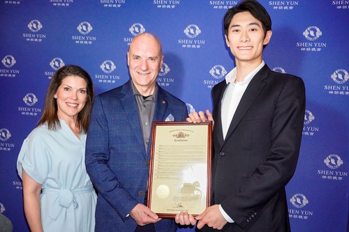 मिसौरी राज्य के प्रतिनिधि जॉर्ज ह्रुज़ा (केंद्र में) और उनकी पत्नी ने 21 मार्च को दूसरे शो के दौरान शेन युन को एक घोषणापत्र प्रस्तुत किया (स्क्रीनशॉट एनटीडी टेलीविजन के सौजन्य से)